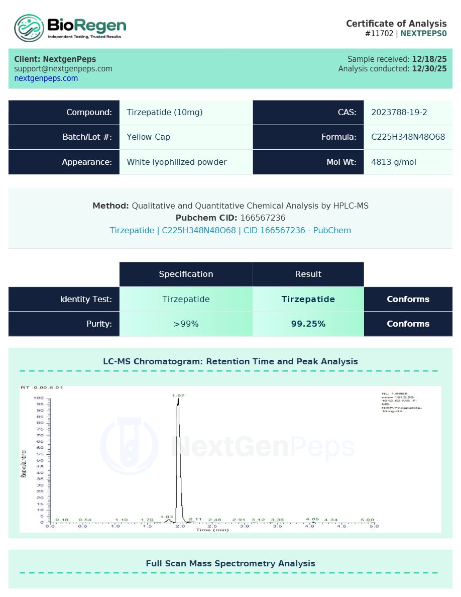 NextGenPeps provides GLP-TZ solely as a research peptide for in vitro studies or approved animal experimentation. This product is not approved for human consumption, medical treatment, or clinical use of any kind.