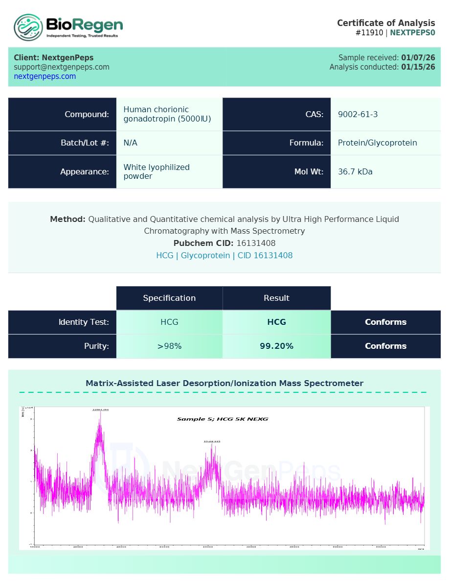 Research‐grade 5000 IU HCG (NextGenPeps/BioRegen COA)