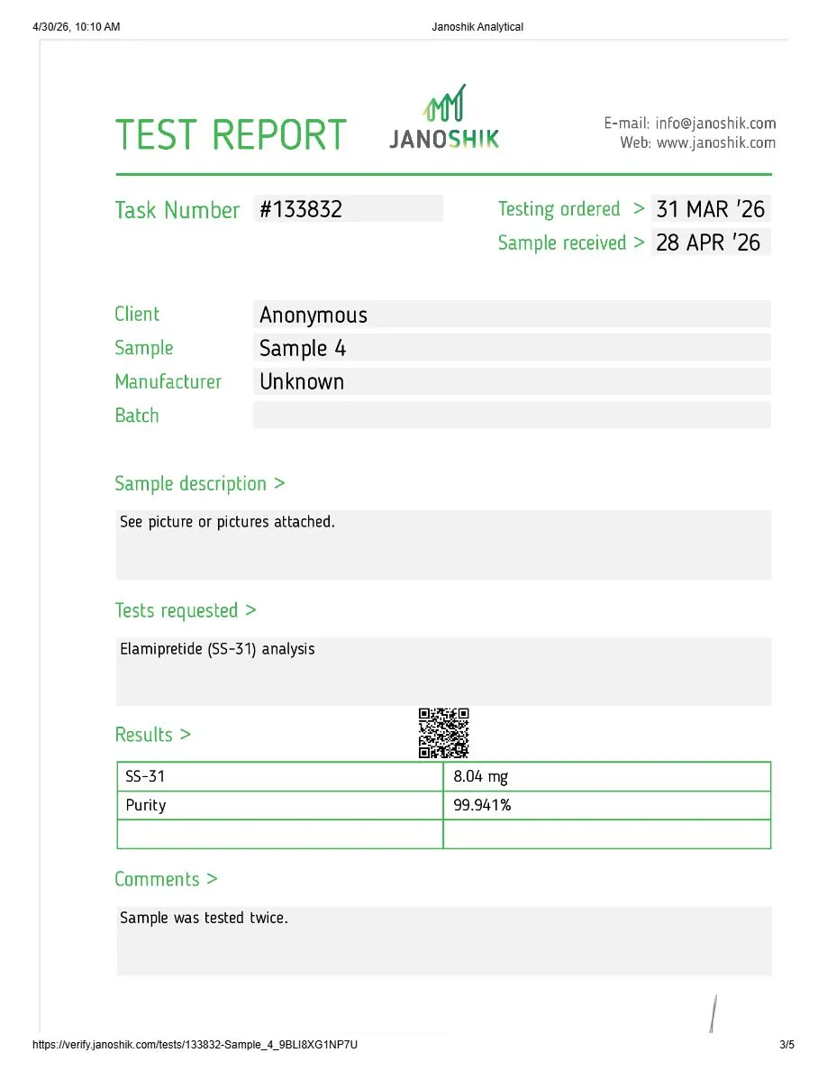 SS‐31 is supplied as a lyophilized white powder in glass vials at ≥99% purity, verified by HPLC with a batch‐specific certificate of analysis.